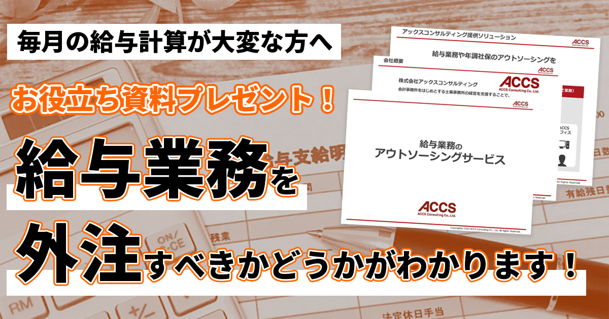 資料DL申込フォーム 豊富な実績を持つ弊社のノウハウを踏まえ 業務負荷を改善するポイントを解説します! 給与計算について、多くの企業は ・担当者の急な退職 ・業務のブラックボックス化 などの理由でアウトソースを検討されます。 このレポートではもどのような状況の場合 給与業務のアウトソースが向いているのか メリット・デメリットを踏まえ解説します。 自社で給与業務を続けるか アウトソースしたほうがよいか ご検討中の方は、ぜひご覧ください。